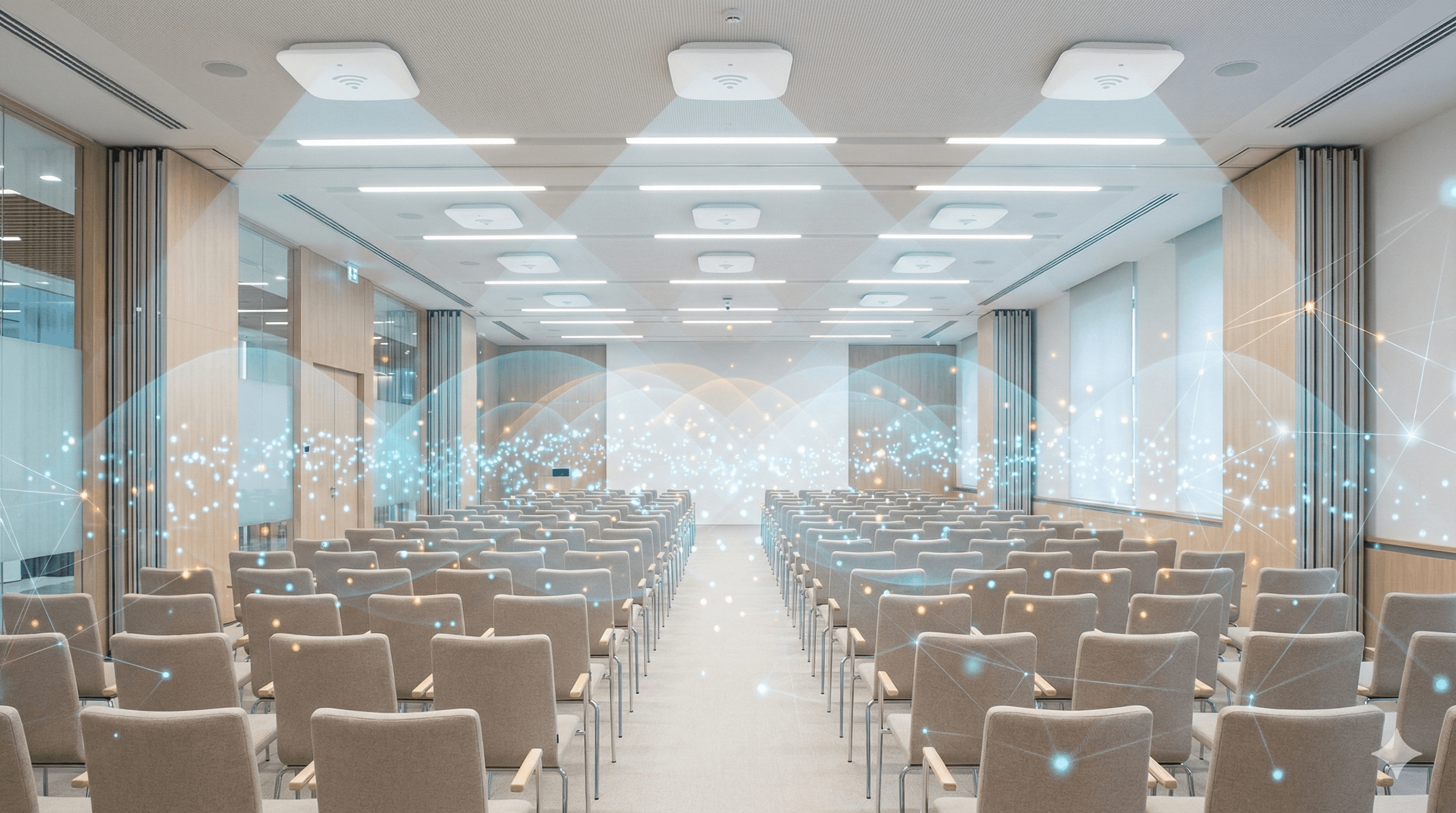 Conference halls: Mount APs above seating with overlapping coverage. Don't just line them up on perimeter walls-that leaves the middle with a terrible signal where everyone's actually sitting.